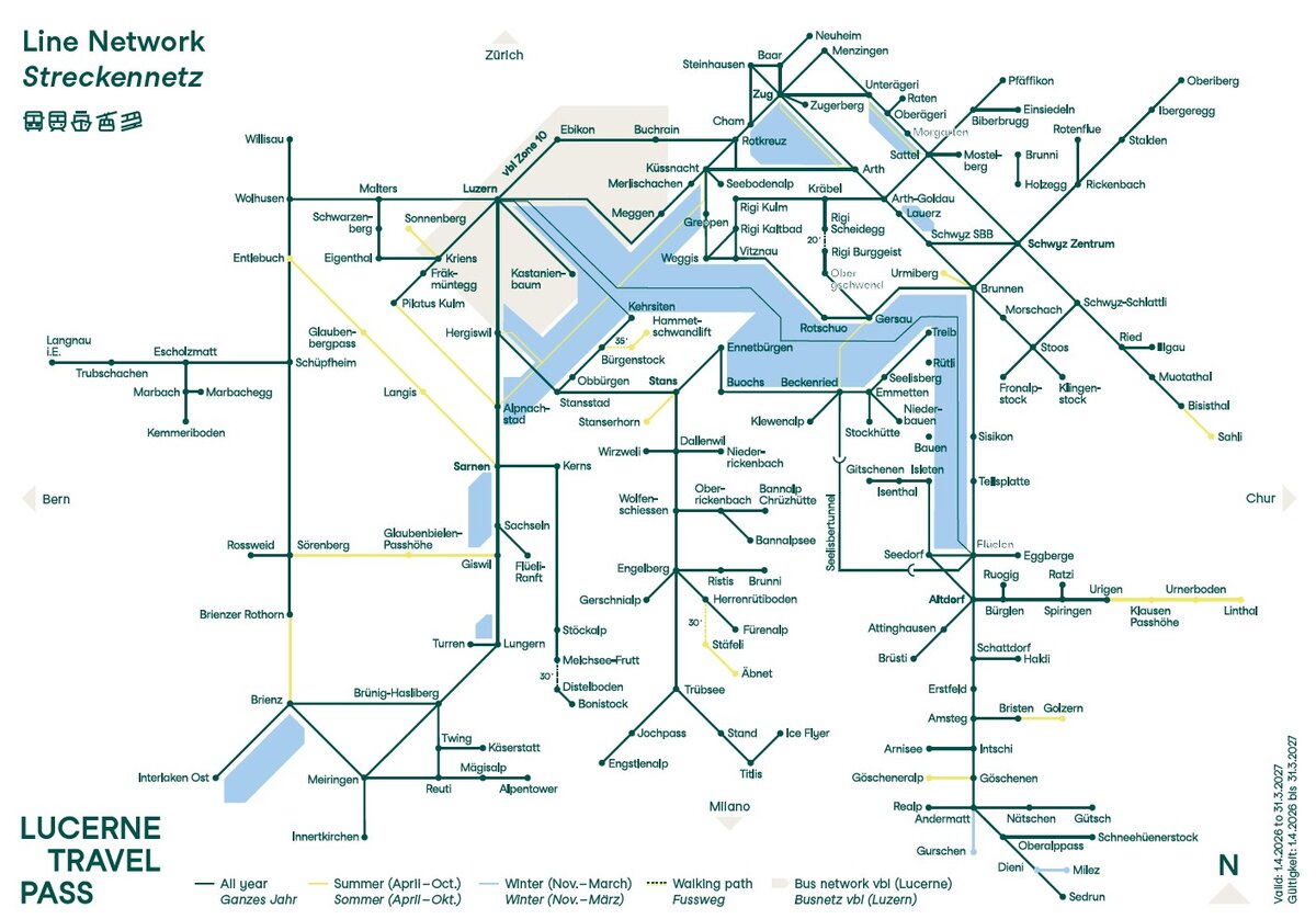 Sur le réseau ci-dessous, vous pouvez voyager librement en train, en bus, en bateau et en téléphérique: